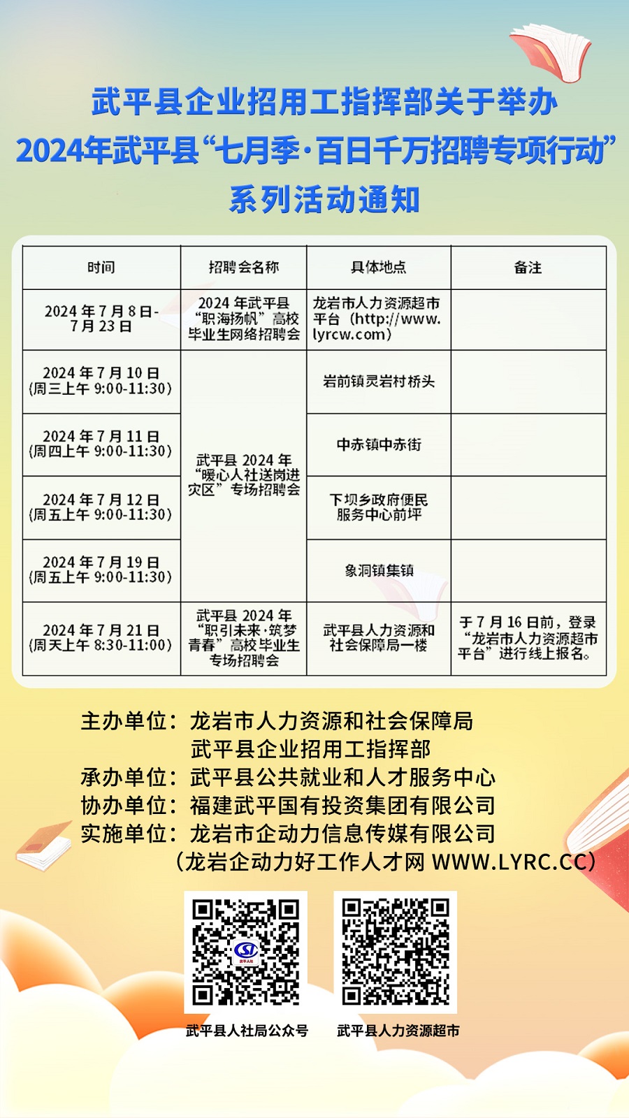 • 2024年武平縣“七月季·百日千萬(wàn)招聘專(zhuān)項(xiàng)行動(dòng)”系列活動(dòng)公告