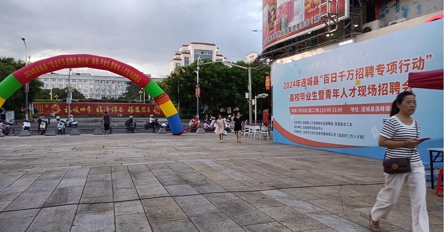•   為深入貫徹落實(shí)黨中央、國(guó)務(wù)院關(guān)于促進(jìn)高校畢業(yè)生等青年就業(yè)工作決策部署,強(qiáng)化高校畢業(yè)生等青年群體就業(yè)服務(wù),暢通求職招聘渠道,連城縣人力資源和社會(huì)保障局定于2024年7月30日晚上舉辦的“才聚連城 職等你來(lái)”2024年連城縣“百日千萬(wàn)招聘專項(xiàng)行動(dòng)”高校畢業(yè)生暨青年人才現(xiàn)場(chǎng)招聘會(huì)在連城縣蓮峰鎮(zhèn)中山街廣場(chǎng)成功舉辦。