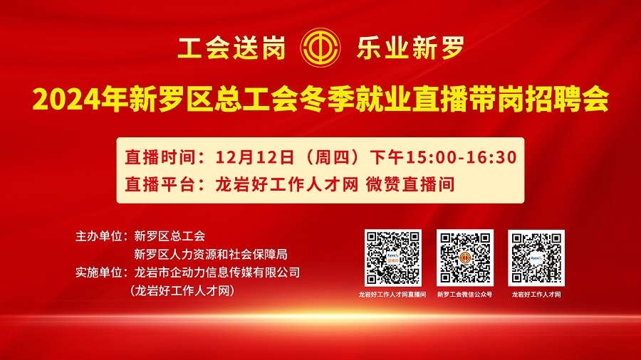 為深入貫徹黨中央、國務(wù)院關(guān)于“促進(jìn)高質(zhì)量充分就業(yè)”的決策部署,幫助各類企業(yè)招工穩(wěn)崗,搭建我市企業(yè)與求職者的供需對(duì)接平臺(tái),新羅區(qū)總工會(huì)定于2024年12月12日(星期四)下午15:00-17:00舉辦“工會(huì)送崗 樂業(yè)新羅”2024年新羅區(qū)總工會(huì)冬季就業(yè)直播帶崗招聘會(huì)。