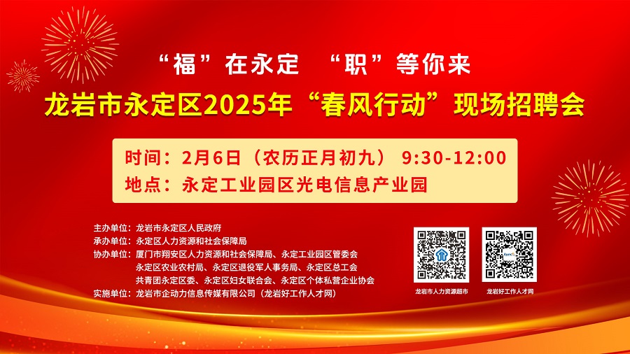 為做好春節(jié)期間就業(yè)創(chuàng)業(yè)工作,更好地服務(wù)發(fā)展、服務(wù)人才、服務(wù)民生,保障企業(yè)用工需求,為企業(yè)與求職者提供交流平臺,龍巖市永定區(qū)人民政府、區(qū)人力資源和社會保障局、永定工業(yè)園區(qū)管委會、區(qū)農(nóng)業(yè)農(nóng)村局、區(qū)退役軍人事務(wù)局、區(qū)總工會、團區(qū)委、區(qū)婦聯(lián)、區(qū)個私協(xié)會決定舉辦“福”在永定 “職”等你來龍巖市永定區(qū)2025年“春風行動”現(xiàn)場招聘會,