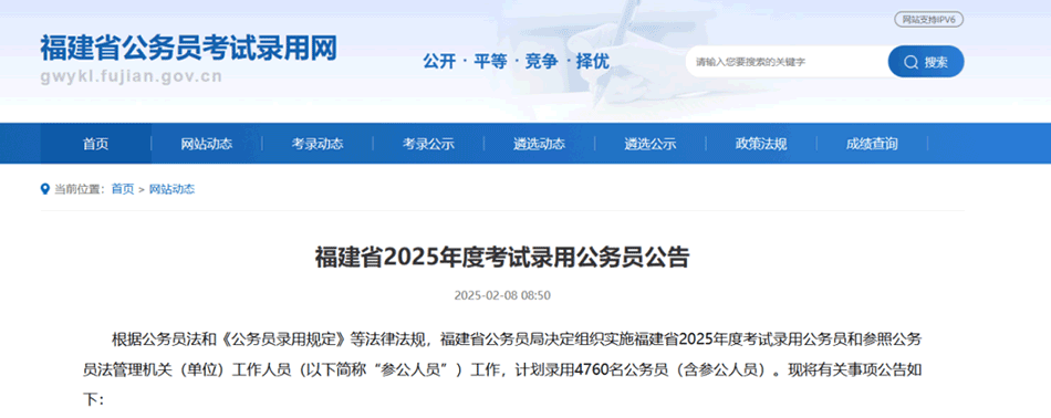 福建省2025年度考試錄用公務(wù)員公告