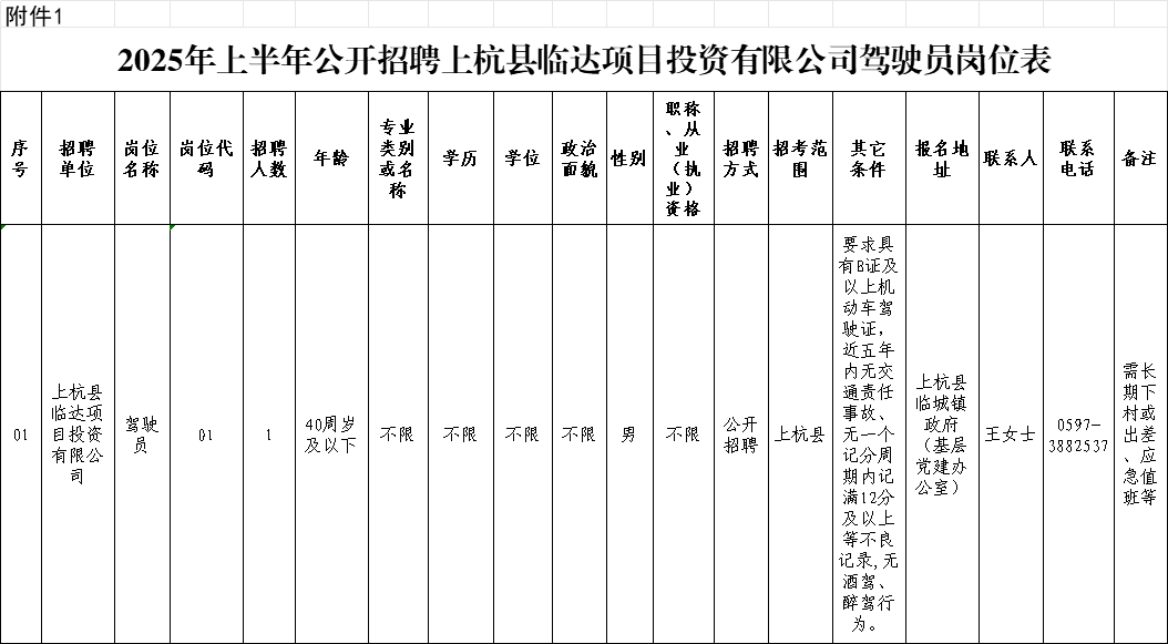 1.2025年上半年公開招聘上杭縣臨達(dá)項(xiàng)目投資有限公司駕駛員崗位表
