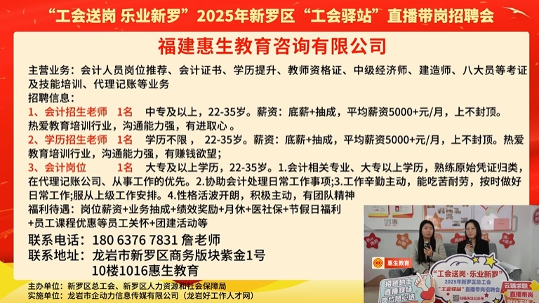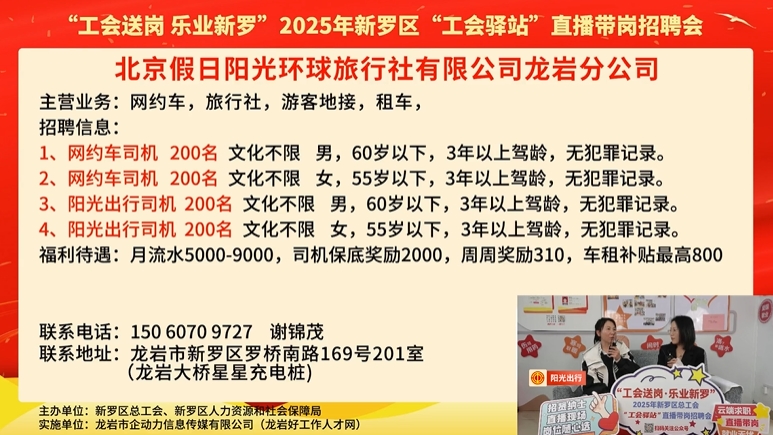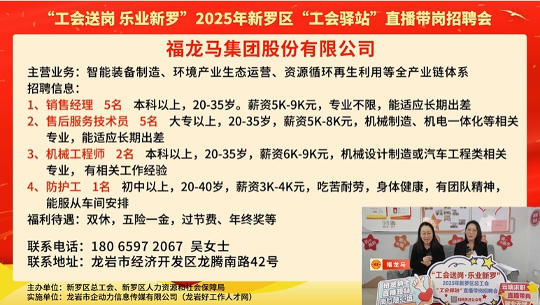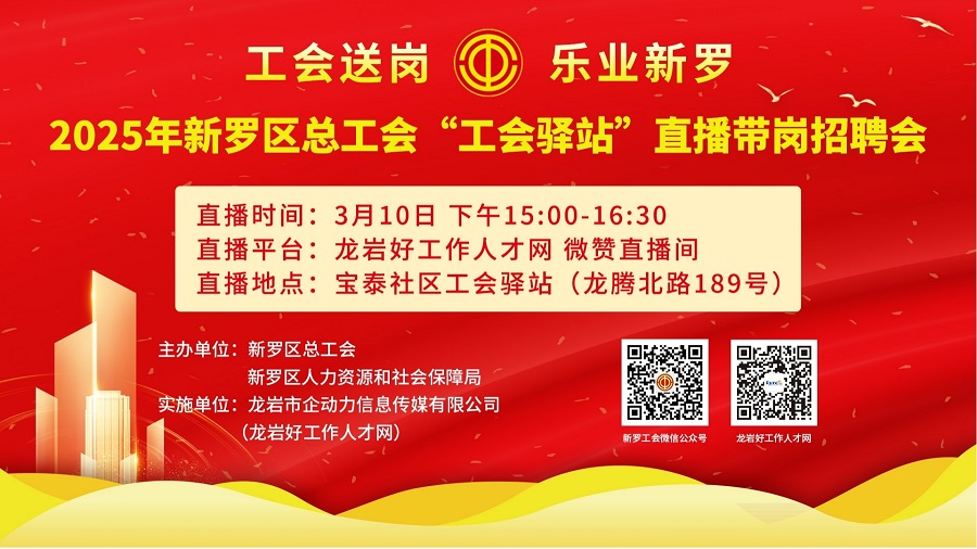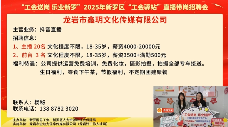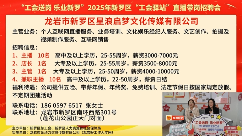 此次招聘會(huì)由新羅區(qū)總工會(huì)主辦;龍巖市企動(dòng)力信息傳媒有限公司(龍巖好工作人才網(wǎng))實(shí)施,以“工會(huì)送崗 樂業(yè)新羅”為主題,組織了7家企業(yè)到場(chǎng)直播,企業(yè)通過(guò)“坐播”的形式在龍巖好工作人才網(wǎng)微贊直播間及龍巖好工作人才網(wǎng)視頻號(hào)開展直播帶崗活動(dòng)。