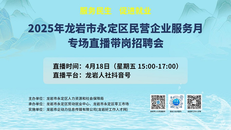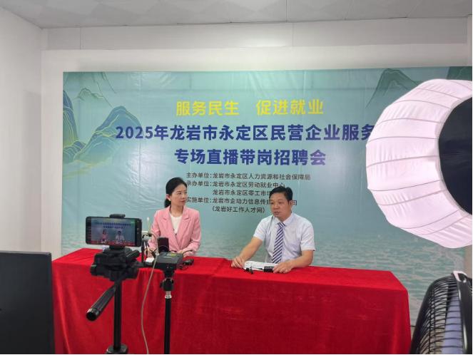 為深入貫徹黨中央、國務(wù)院關(guān)于“促進(jìn)高質(zhì)量充分就業(yè)”的決策部署,幫助各類企業(yè)招工穩(wěn)崗,搭建我區(qū)企業(yè)與求職者的供需對接平臺,龍巖市永定區(qū)人力資源和社會保障局于2025年4月18日舉辦“服務(wù)民生 促進(jìn)就業(yè)”2025年龍巖市永定區(qū)民營企業(yè)服務(wù)月專場直播帶崗招聘會。
