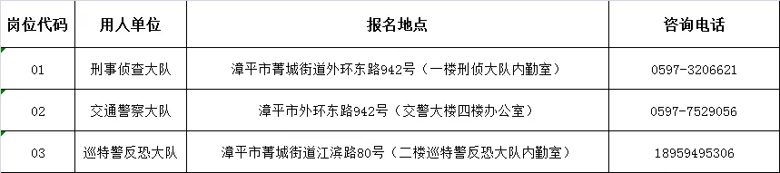2.體檢參照國(guó)家公務(wù)員錄用標(biāo)準(zhǔn)進(jìn)行。政審內(nèi)容主要包括應(yīng)聘人員的政治表現(xiàn)、道德品質(zhì)等,并對(duì)應(yīng)聘人員是否符合規(guī)定的崗位資格條件、提交的有關(guān)材料信息是否真實(shí)準(zhǔn)確等進(jìn)行復(fù)核,政審不合格者不予聘用。附件:《漳平市公安局招聘輔警員政審表》《漳平市公安局輔警招聘報(bào)名表》