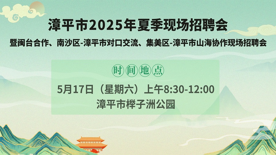 為促進(jìn)閩臺(tái)合作、南沙區(qū)-漳平市對(duì)口交流、集美區(qū)-漳平市山海協(xié)作,進(jìn)一步推進(jìn)城鎮(zhèn)失業(yè)人員再就業(yè)和農(nóng)村富余勞動(dòng)力轉(zhuǎn)移就業(yè),搭建更加高效、便捷的就業(yè)平臺(tái),決定舉辦漳平市2025年夏季現(xiàn)場招聘會(huì)暨閩臺(tái)合作、南沙區(qū)-漳平市對(duì)口交流、集美區(qū)-漳平市山海協(xié)作現(xiàn)場招聘會(huì)。