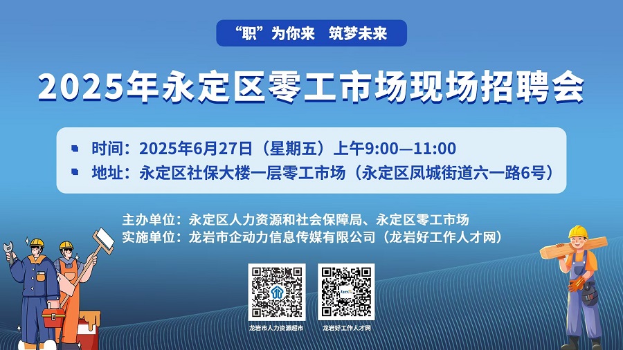 地址:永定區(qū)社保大樓一層零工市場(chǎng)(永定區(qū)鳳城街道六一路6號(hào))
