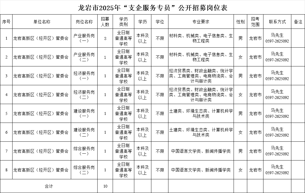 本次計(jì)劃招募龍巖市“支企服務(wù)專員”10名,派駐到龍巖高新區(qū)(經(jīng)開區(qū))從事服務(wù)企業(yè)工作,服務(wù)期限2年。具體招募崗位及要求詳見《龍巖市2025年“支企服務(wù)專員”公開招募崗位表》(附件1)。報(bào)考人員可登錄龍巖市人力資源和社會(huì)保障局官網(wǎng)(http://rsj.longyan.gov.cn/)或龍巖人事考試網(wǎng)(http://syzp.lyrszx.cn/syzp/indexpage)查閱。