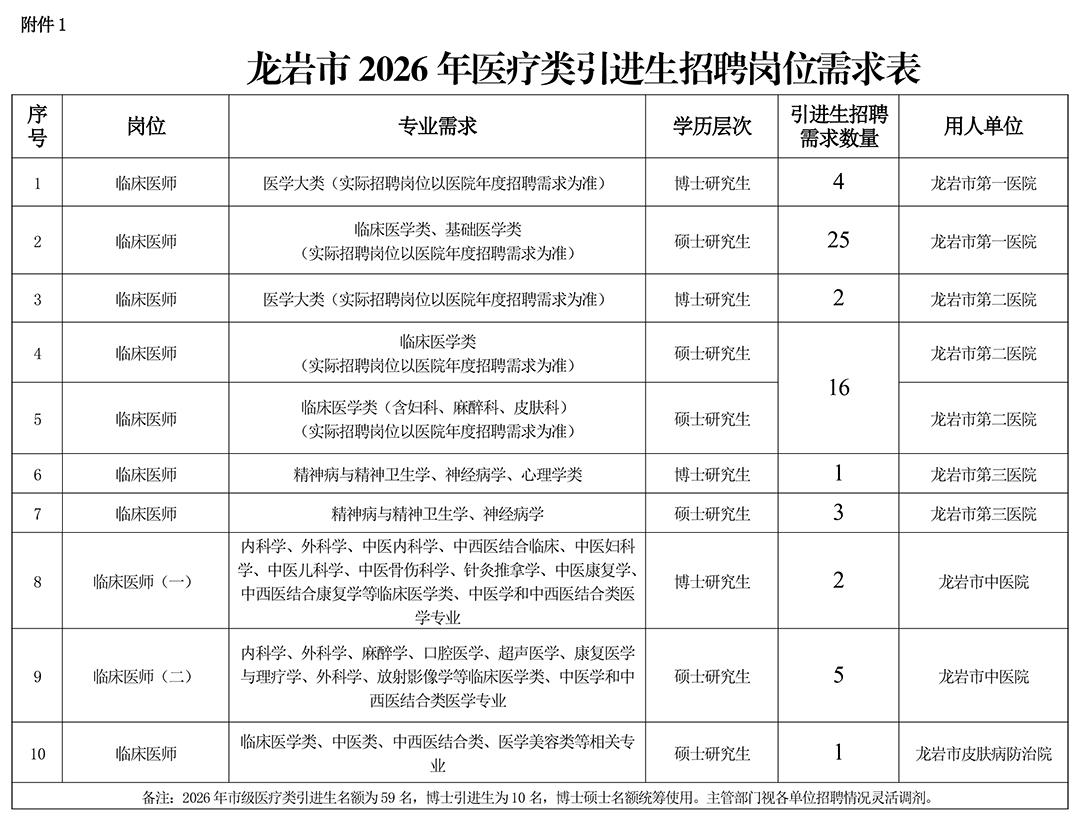 1.龍巖市2026年醫(yī)療類引進(jìn)生招聘崗位需求表