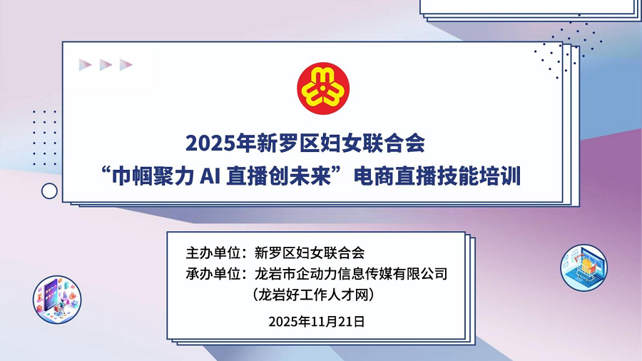 數(shù)字經(jīng)濟(jì)蓬勃發(fā)展,AI技術(shù)與電商直播深度融合,催生創(chuàng)業(yè)就業(yè)新賽道。女性憑借細(xì)膩、耐心、善溝通的天然優(yōu)勢(shì),在直播電商領(lǐng)域潛力凸顯,成為“她經(jīng)濟(jì)”發(fā)展核心力量。為助力新羅區(qū)女性把握數(shù)字時(shí)代機(jī)遇,破解傳統(tǒng)創(chuàng)業(yè)瓶頸、拓寬增收渠道,新羅區(qū)婦女聯(lián)合會(huì)于2025年11月21日成功舉辦“巾幗聚力 AI 直播創(chuàng)未來(lái)”電商直播技能培訓(xùn)。活動(dòng)旨在讓更多女性借直播電商實(shí)現(xiàn)自我價(jià)值,以巾幗之力激活消費(fèi)新動(dòng)能,在數(shù)字經(jīng)濟(jì)浪潮中書寫創(chuàng)業(yè)增收新篇章。 本次培訓(xùn)聚焦有AI電商直播創(chuàng)業(yè)意愿的城鄉(xiāng)女性,以及待業(yè)、下崗女性及全職媽媽等群體的發(fā)展需求,打造了一套涵蓋AI電商直播核心領(lǐng)域的課程體系。邀請(qǐng)AI電商直播行業(yè)資深講師手把手教學(xué),每一個(gè)知識(shí)點(diǎn)均緊貼行業(yè)前沿與市場(chǎng)需求,通過(guò)理論與實(shí)踐深度融合,讓每一項(xiàng)技能都力求實(shí)用落地、學(xué)以致用。