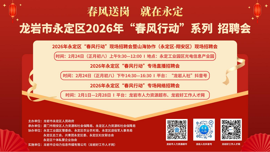 。1)登陸龍巖市人力資源超市網(wǎng)站(網(wǎng)址:www.lyrcw.com)、龍巖好工作人才網(wǎng)(www.jinhangda.com.cn),發(fā)布有效崗位,選擇“春風(fēng)送崗 就在永定”2026年永定區(qū)“春風(fēng)行動”專場網(wǎng)絡(luò)招聘會進(jìn)行報(bào)名。