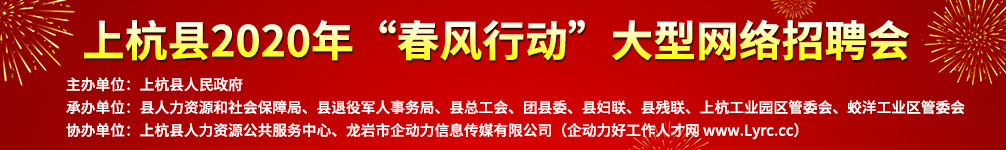 主辦單位: 上杭縣人民政府 承辦單位:縣人力資源和社會(huì)保障局、縣退役軍人事務(wù)局、縣總工會(huì)、團(tuán)縣委、縣婦聯(lián)、縣殘聯(lián)、上杭工業(yè)園區(qū)管委會(huì)、蛟洋工業(yè)區(qū)管委會(huì) 協(xié)辦單位:上杭縣人力資源公共服務(wù)中心、龍巖市企動(dòng)力信息傳媒有限公司(企動(dòng)力好工作人才網(wǎng) www.jinhangda.com.cn)