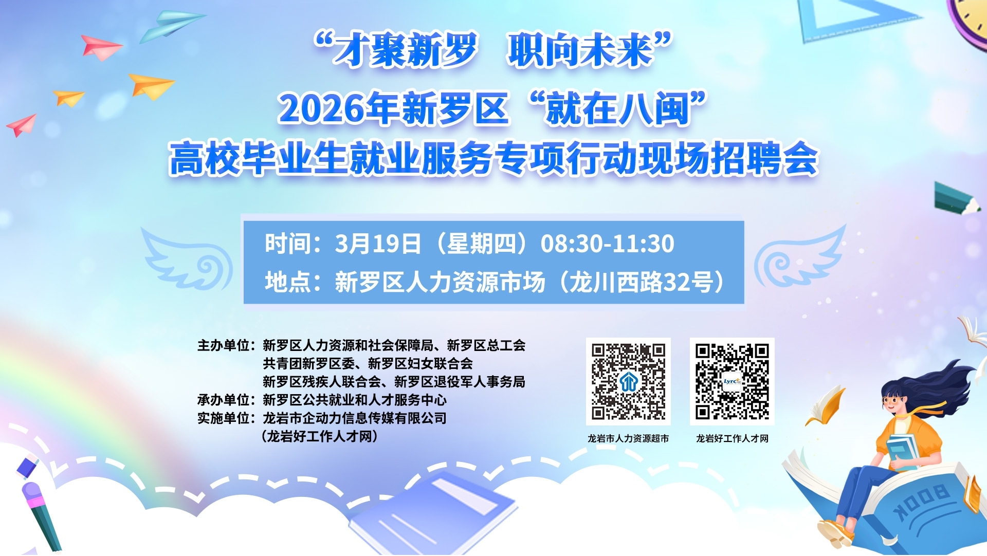主辦單位: 新羅區(qū)人力資源和社會保障局 新羅區(qū)總工會 共青團(tuán)新羅區(qū)委 新羅區(qū)婦女聯(lián)合會 新羅區(qū)殘疾人聯(lián)合會 新羅區(qū)退役軍人事務(wù)局