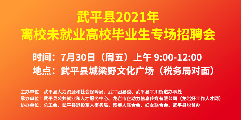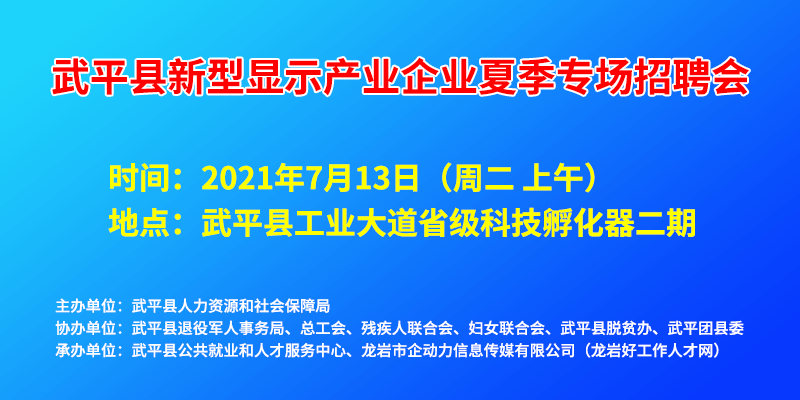 舉辦單位:武平縣人力資源和社會保障局、共青團武平縣委、武平縣平川街道辦事處、武平縣城廂鎮(zhèn)人民政府