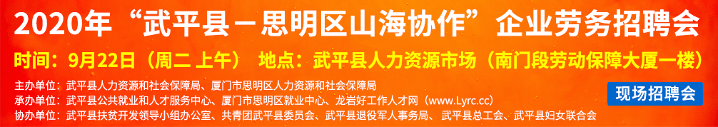 舉辦單位:武平縣人力資源和社會保障局、廈門市思明區(qū)人力資源和社會保障局 承辦單位:武平縣公共就業(yè)和人才服務(wù)中心、廈門市思明區(qū)就業(yè)中心、龍巖好工作人才網(wǎng)