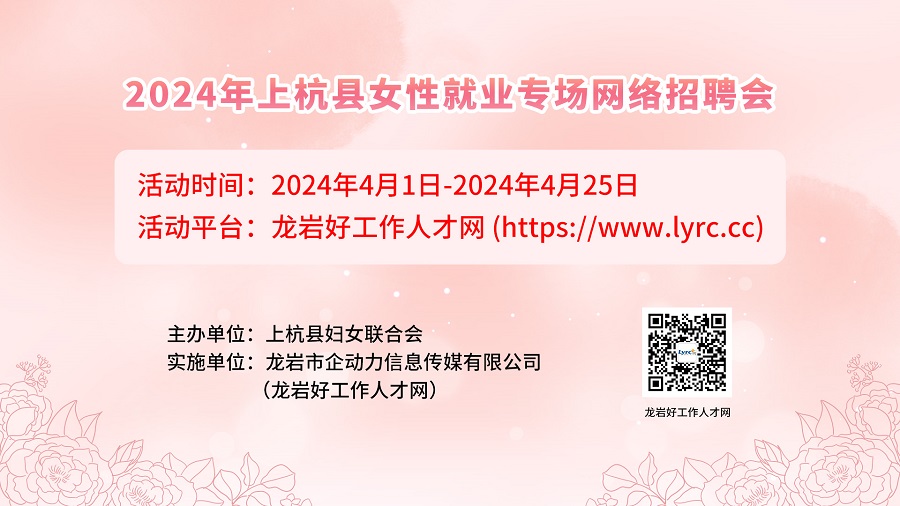 舉辦地點:龍巖市人力資源超市 上杭縣智慧就業(yè)平臺 龍巖好工作人才網(wǎng)