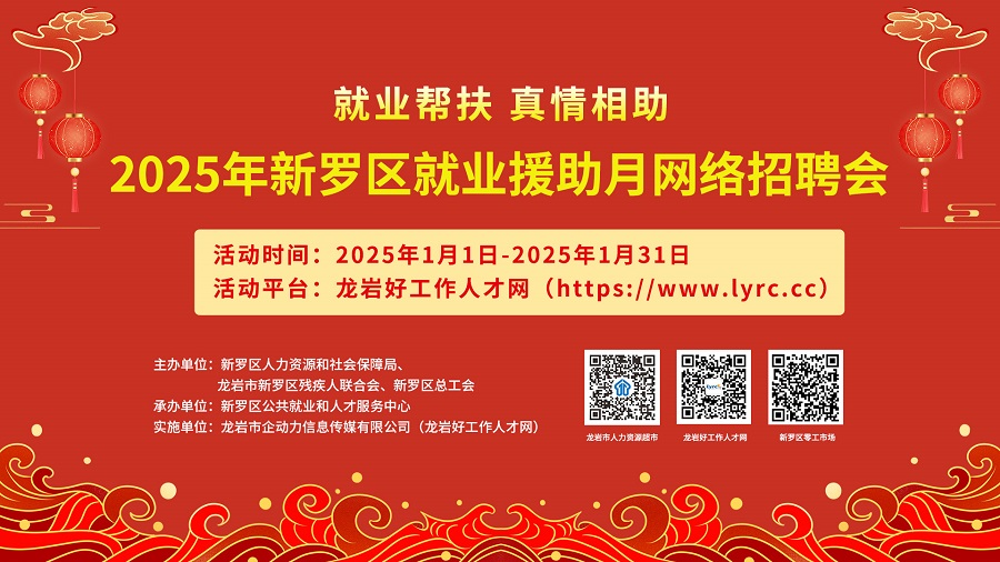 舉辦單位:新羅區(qū)人力資源和社會保障局、共青團新羅區(qū)委、龍巖市新羅區(qū)殘疾人聯(lián)合會、新羅區(qū)總工會、龍巖市新羅區(qū)婦女聯(lián)合會、新羅區(qū)退役軍人事務(wù)局