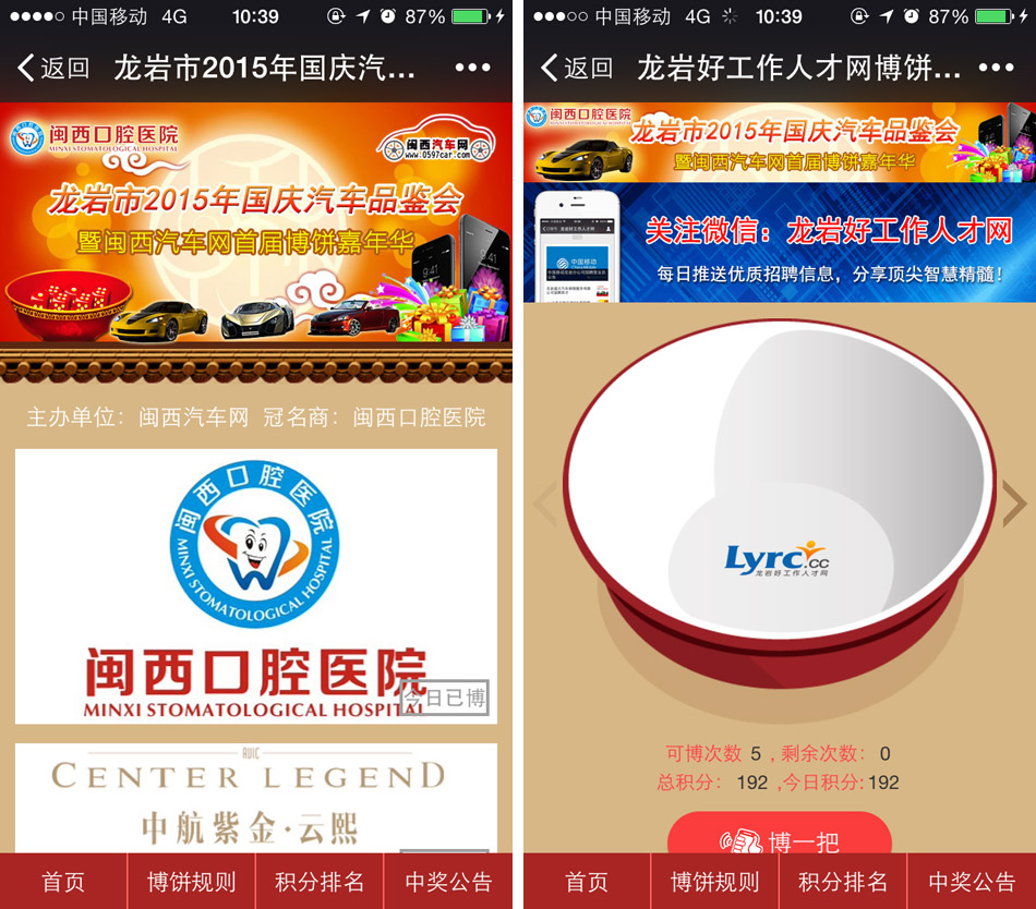 7.參與博餅用戶(hù)需關(guān)注閩西汽車(chē)網(wǎng)官方微信(微信ID:mxqcw-0597car或搜索關(guān)注:閩西汽車(chē)網(wǎng));蛲ㄟ^(guò)閩西汽車(chē)網(wǎng)觸屏版(m.0597car.com)鏈接進(jìn)入。