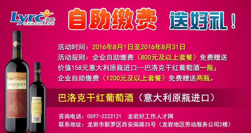 活動(dòng)對象:新老客戶均可參加,但必須通過龍巖好工作人才網(wǎng)在線自助繳費(fèi)支付成功的客戶(800元及以上套餐),可獲得一瓶價(jià)值158元意大利原瓶進(jìn)口--巴洛克干紅葡萄酒,1200元及以上套餐可獲得兩瓶,付款成功后免費(fèi)包郵送貨上門;