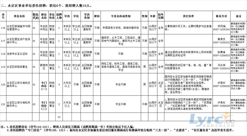 龍巖市永定區(qū)事業(yè)單位委托公開招聘職位中注明“專門崗位”的,專門面向在龍巖市永定區(qū)參加服務(wù)基層項(xiàng)目服務(wù)期滿或行將期滿考核合格的“三支一扶”、“志愿者”、“社區(qū)服務(wù)者”高校畢業(yè)生進(jìn)行招考。
