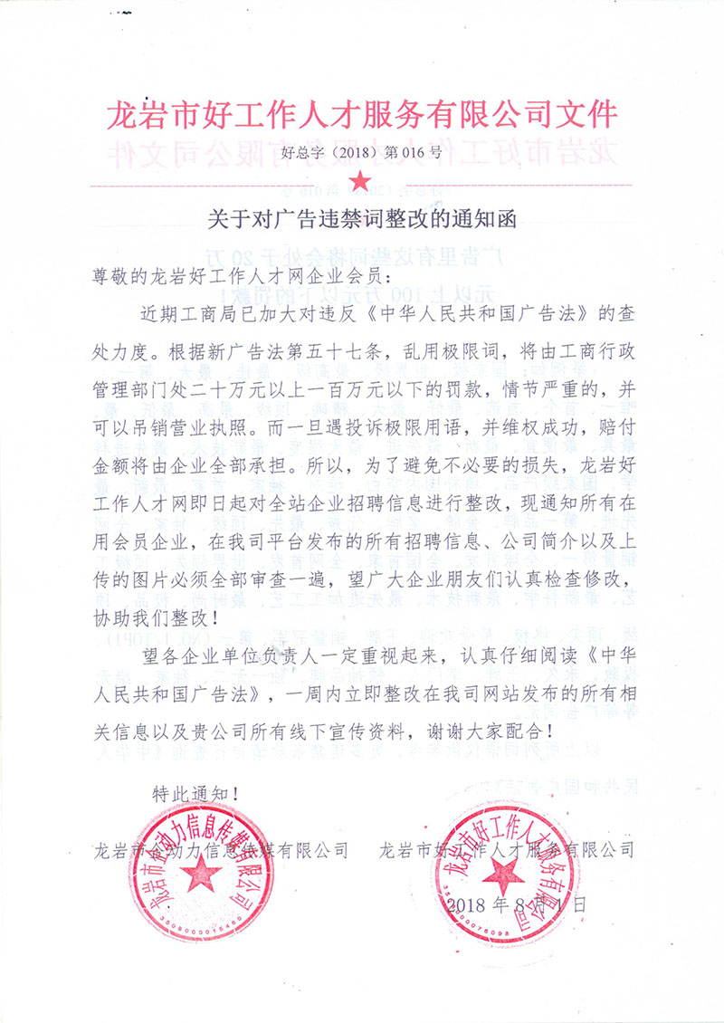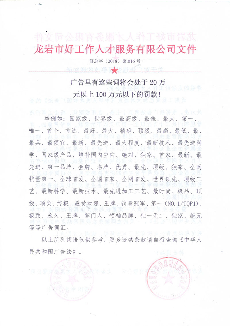 本網(wǎng)站經(jīng)福建省龍巖市人社局批準,為正規(guī)合法人才網(wǎng)站,人力資源服務(wù)許可證:(閩)人服證字〔2019〕第0801000113號