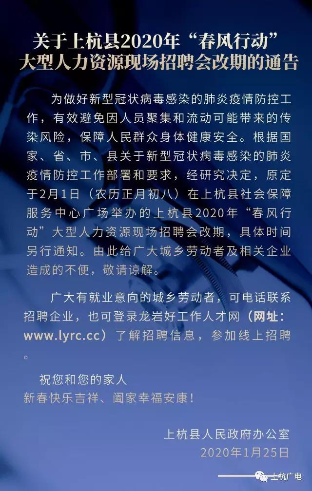 全力做好新型冠狀病毒感染的肺炎疫情防控工作,有效切斷病毒傳播途徑,確保人民群眾生命安全和身體健康,根據(jù)國家、省、市、縣關(guān)于新型冠狀病毒感染的肺炎疫情防控工作部署和要求,經(jīng)研究決定,原定于2月1日(農(nóng)歷正月初八)在上杭縣社會保障服務(wù)中心廣場舉辦的上杭縣2020年“春風(fēng)行動”大型人力資源現(xiàn)場招聘會改期,具體時間另行通知。由此給廣大城鄉(xiāng)勞動者及相關(guān)企業(yè)造成的不便,敬請諒解。