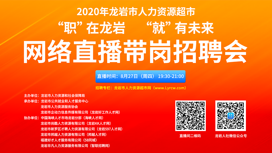 為做好“六穩(wěn)”工作,落實(shí)“六保”任務(wù),進(jìn)一步服務(wù)企業(yè)用工,促進(jìn)勞動(dòng)者就業(yè),龍巖市人力資源超市將舉辦網(wǎng)絡(luò)直播帶崗招聘會(huì)。通過(guò)在線交流,為我市有用工需求的企業(yè)和各類求職人員搭建對(duì)接平臺(tái),打造“就業(yè)服務(wù)不打烊,網(wǎng)上招聘不停歇”的線上服務(wù)新模式。