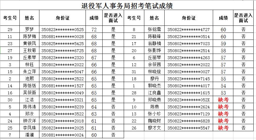 【成績(jī)公示】2020年新羅區(qū)退役軍人事務(wù)局招考成績(jī)公示
