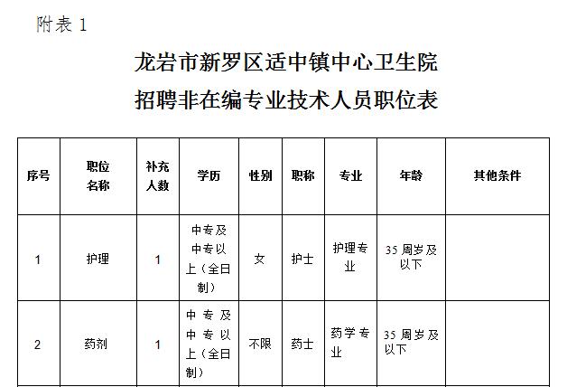 本次公開招聘非在編專業(yè)技術(shù)人員2名,具體的招聘職位、招聘人數(shù)及職位資格條件等,詳見《龍巖市新羅區(qū)適中鎮(zhèn)中心衛(wèi)生院公開招聘非在編專業(yè)技術(shù)人員職位表》(見附件1)。