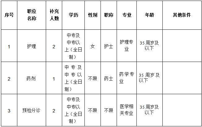 由于我院工作需要,根據(jù)《事業(yè)單位人事管理?xiàng)l例》、《事業(yè)單位公開招聘人員暫行規(guī)定》,經(jīng)研究決定公開招聘非在編護(hù)士人員2名,藥劑1名、衛(wèi)生專業(yè)技術(shù)人員2名,F(xiàn)將招聘工作有關(guān)事項(xiàng)公告如下: