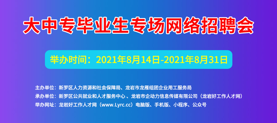 為貫徹落實習(xí)近平總書記來閩考察重要講話精神,結(jié)合黨史學(xué)習(xí)教育“為民辦實事”活動工作部署,鼓勵高校畢業(yè)生留巖來巖就業(yè),搭建用人單位與高校畢業(yè)生雙向?qū)悠脚_,新羅區(qū)人力資源和社會保障局、龍巖市龍雁組團企業(yè)用工服務(wù)局將聯(lián)合舉辦《大中專畢業(yè)生專場網(wǎng)絡(luò)招聘會》。