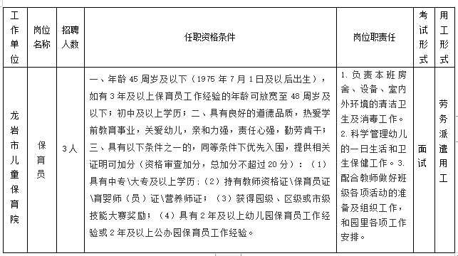 (一)聘用:體檢合格的應(yīng)聘人員,與龍巖市人力資源服務(wù)有限公司簽訂勞動(dòng)合同,再派遣至龍巖市兒童保育院工作。