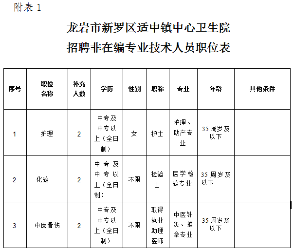 附件:龍巖市新羅區(qū)適中鎮(zhèn)中心衛(wèi)生院招聘非在編專業(yè)技術(shù)人員職位表