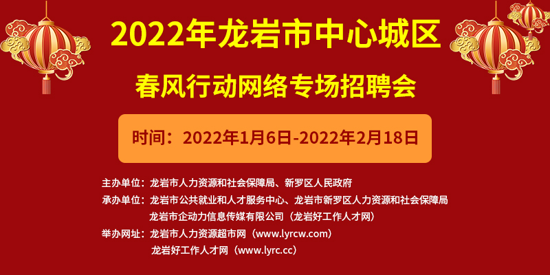 為做好龍巖市中心城區(qū)春節(jié)期間就業(yè)創(chuàng)業(yè)工作活動,搭建企業(yè)與求職者雙向對接平臺,龍巖市人力資源和社會保障局、新羅區(qū)人民政府擬聯合舉辦“2022年龍巖市中心城區(qū)春風行動網絡專場招聘會”。