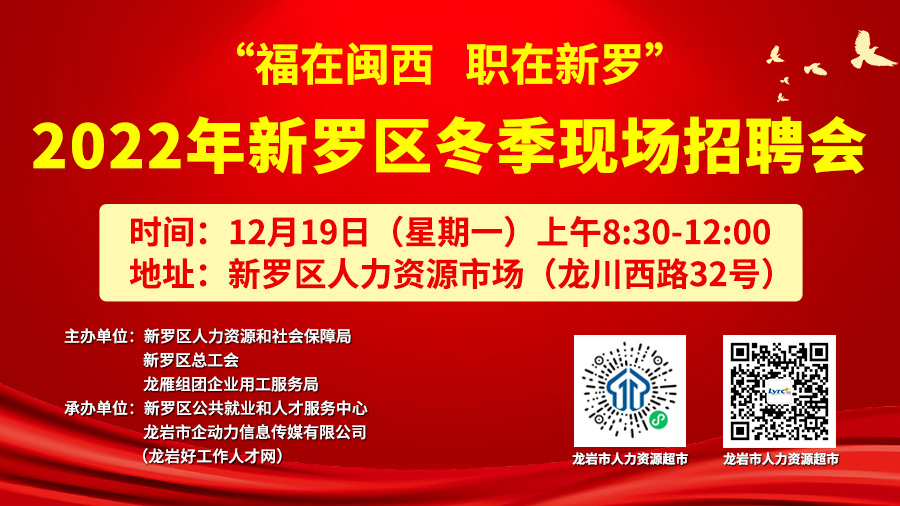 【12月19日現(xiàn)場(chǎng)招聘會(huì)】“福在閩西 職在新羅”2022年新羅區(qū)冬季現(xiàn)場(chǎng)招聘會(huì)