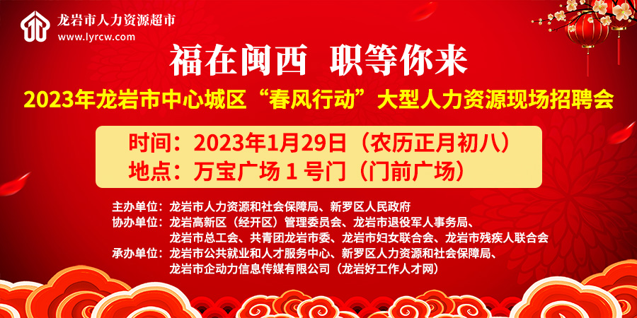 為全面貫徹黨的二十大精神,堅決落實中央、省、市關(guān)于就業(yè)工作決策部署,搭建春節(jié)期間龍巖市中心城區(qū)企業(yè)與求職者雙向?qū)悠脚_,龍巖市人力資源和社會保障局、新羅區(qū)人民政府?dāng)M聯(lián)合舉辦2023年龍巖市中心城區(qū)“春風(fēng)行動”大型人力資源現(xiàn)場招聘會。