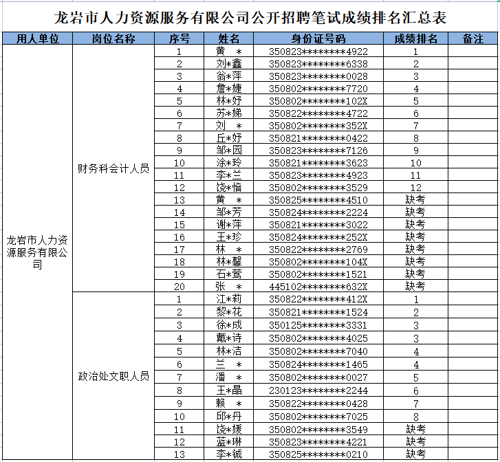 根據(jù)2022年12月9日發(fā)布的《龍巖市人力資源服務(wù)有限公司公開招聘派遣員工公告》、2022年12月21日發(fā)布的《龍巖市人力資源服務(wù)有限公司公開招聘派遣員工調(diào)整資格條件延期報(bào)名的補(bǔ)充公告》有關(guān)要求,現(xiàn)將派遣至龍巖監(jiān)獄財(cái)務(wù)科會計(jì)及政治處文員崗位筆試成績排名予以公示。