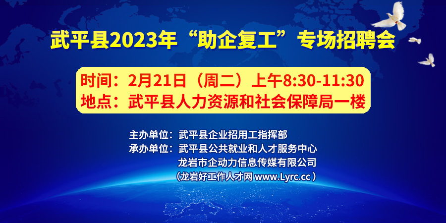 根據(jù)《武平縣企業(yè)招用工指揮部關(guān)于印發(fā)<武平縣2023年招聘會(huì)活動(dòng)工作方案>的通知》文件精神,決定舉辦武平縣2023年“助企復(fù)工”專場(chǎng)招聘會(huì)。