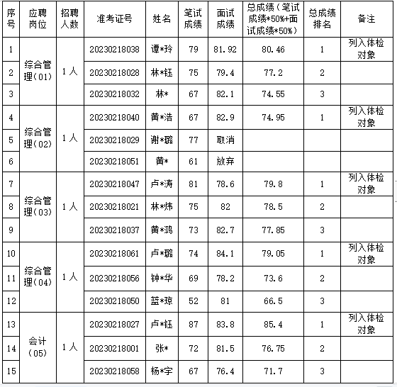 根據(jù)2023年1月1日發(fā)布的《新羅區(qū)供銷合作社聯(lián)合社關(guān)于公開招聘基層供銷社(集體所有制企業(yè))工作人員的公告》、2023年1月11日發(fā)布的《新羅區(qū)供銷合作社聯(lián)合社關(guān)于公開招聘基層供銷社(集體所有制企業(yè))工作人員的補(bǔ)充公告》有關(guān)要求,新羅區(qū)供銷合作社聯(lián)合社基層供銷社(集體所有制企業(yè))綜合管理(崗位代碼01)等5個(gè)崗位考試(筆試+面試)環(huán)節(jié)已經(jīng)組織完成,現(xiàn)將總成績(jī)給予公示: