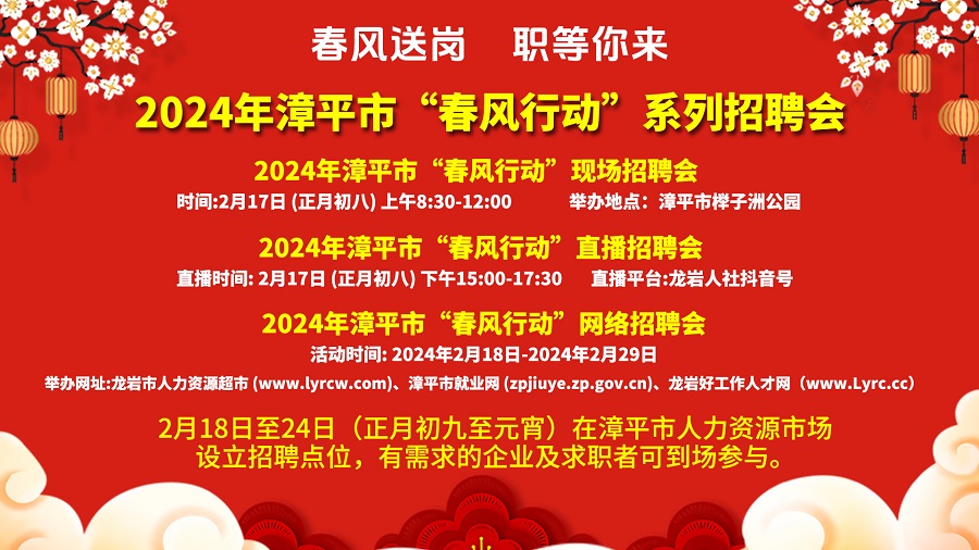 為全面貫徹落實(shí)黨的二十大、二十屆二中全會(huì)精神,認(rèn)真貫徹中央、省委、市委經(jīng)濟(jì)工作會(huì)議部署,更好促進(jìn)全市經(jīng)濟(jì)穩(wěn)定發(fā)展,集中服務(wù)我市企業(yè)和求職者,進(jìn)一步推進(jìn)城鎮(zhèn)失業(yè)人員再就業(yè)和農(nóng)村富余勞動(dòng)力轉(zhuǎn)移就業(yè),滿足企業(yè)用工需求,經(jīng)市委、市政府研究,決定舉辦2024年漳平市“春風(fēng)行動(dòng)”系列招聘會(huì),具體工作方案如下: