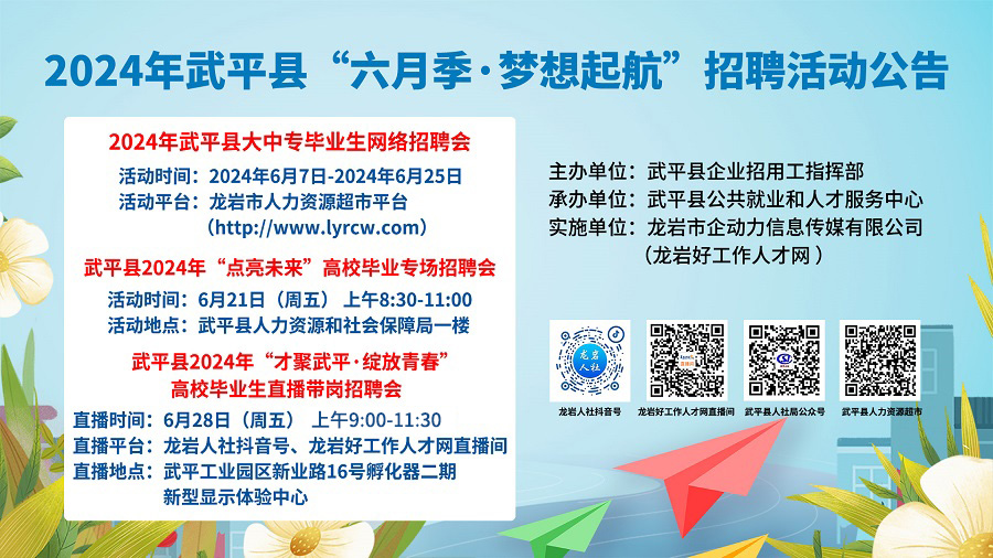 根據(jù)《武平縣企業(yè)招用工指揮部關(guān)于印發(fā)《<武平縣2024年招聘會活動工作方案>的通知》文件精神,為促進(jìn)我縣高校畢業(yè)生充分就業(yè),搭建企業(yè)與高校畢業(yè)生溝通橋梁,發(fā)揮市場在人力資源配置中的作用,決定舉辦“六月季·夢想起航”招聘活動。