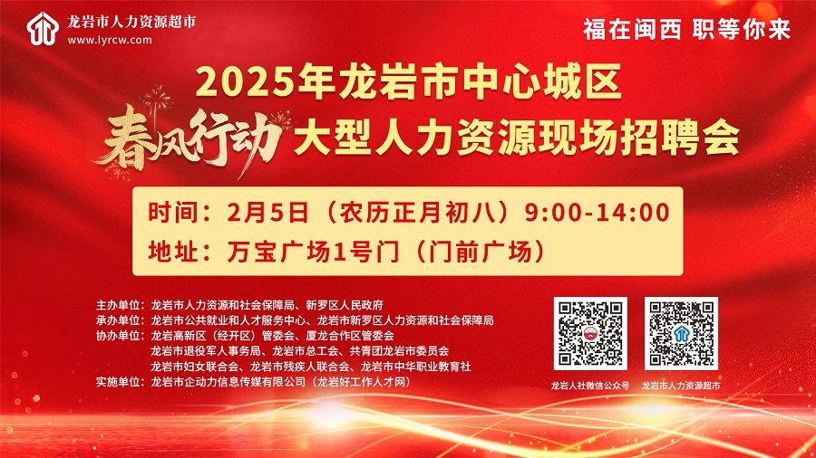為全面貫徹落實黨中央、國務(wù)院關(guān)于就業(yè)工作的決策部署,做好2025年春節(jié)期間用工服務(wù)保障工作,集中幫扶高校畢業(yè)生、農(nóng)民工、退役軍人、就業(yè)困難人員等勞動者就業(yè)創(chuàng)業(yè),建立企業(yè)與高校畢業(yè)生等各類勞動者的對接交流服務(wù)平臺和聯(lián)系渠道,努力實現(xiàn)“就業(yè)有支持、用工有保障、滿意有提升”的活動目的,龍巖市人力資源和社會保障局、新羅區(qū)人民政府定于2025年2月5日(正月初八)聯(lián)合舉辦“福在閩西 職等你來”2025年龍巖市中心城區(qū)“春風(fēng)行動”大型人力資源現(xiàn)場招聘會。