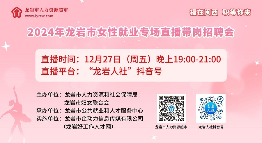 為深入貫徹落實黨中央、國務(wù)院關(guān)于做好就業(yè)工作的決策部署,積極推動女性高質(zhì)量充分就業(yè),助力各類企業(yè)招聘到優(yōu)秀女性人才,全方位支持女性勞動者求職就業(yè)、職業(yè)發(fā)展,龍巖市人力資源和社會保障局、龍巖市婦女聯(lián)合會于2024年12月27日舉辦“福在閩西 職等你來”2024年龍巖市女性就業(yè)專場直播帶崗招聘會。