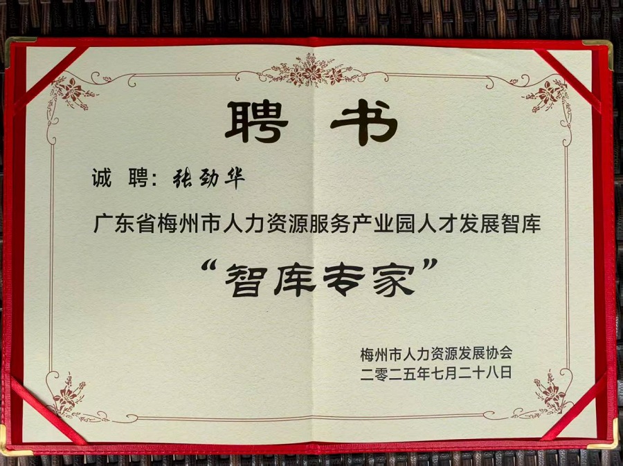喜訊!祝賀張勁華成為廣東省梅州市人力資源服務(wù)產(chǎn)業(yè)園人才發(fā)展智庫專家成員!